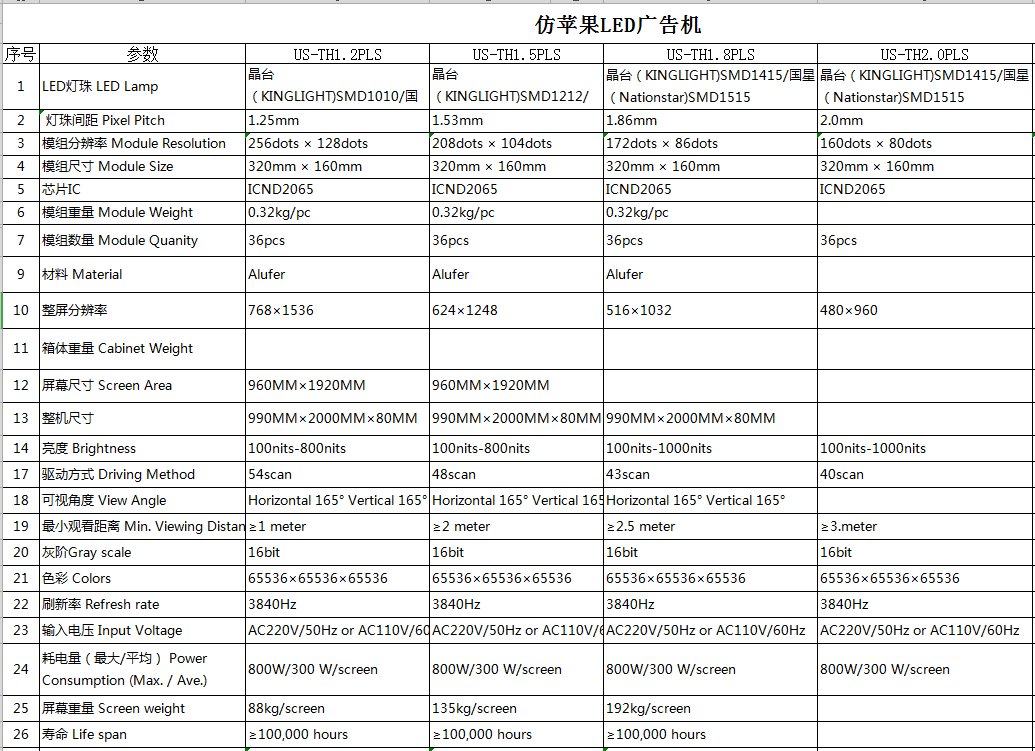 LED室內廣告機參數: